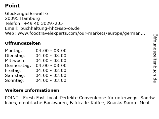| Öffnungszeiten Point in Hamburg anzeigen | |