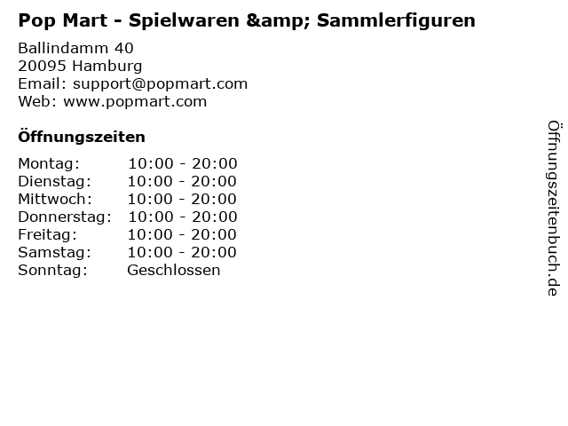 | Öffnungszeiten Pop Mart - Spielwaren & Sammlerfiguren in Hamburg anzeigen | |
