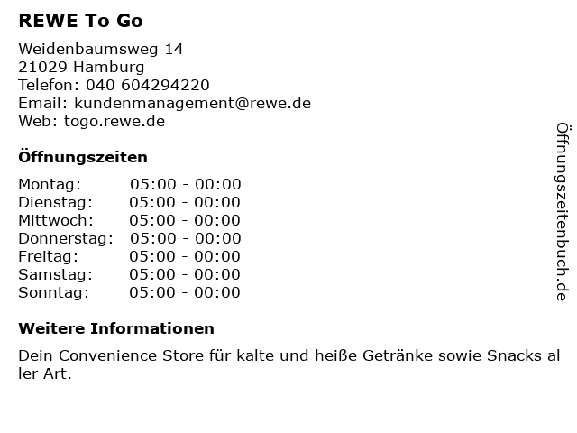 | Öffnungszeiten REWE To Go in Hamburg anzeigen | |