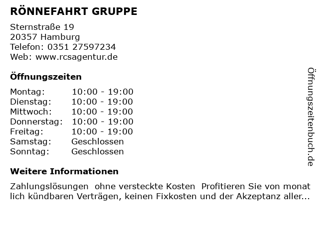 | Öffnungszeiten RÖNNEFAHRT GRUPPE in Hamburg anzeigen | |