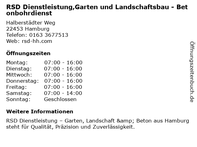 | Branchen & Suchbegriffe zu RSD Dienstleistung,Garten und Landschaftsbau - Betonbohrdienst:bauunternehmen, betonbohrdienst, botanischer garten, dienstleistung, garten, generalunternehmer, gärtner, hausmeisterdienst, landschaftsbau, landschaftsgärtner, rsd |