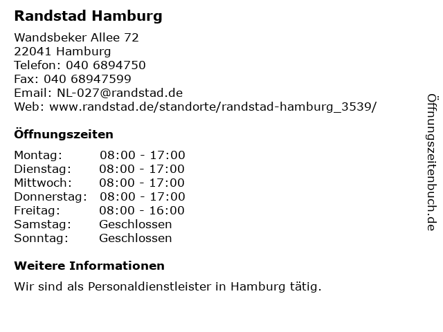 | Öffnungszeiten Randstad Hamburg in Hamburg anzeigen | |