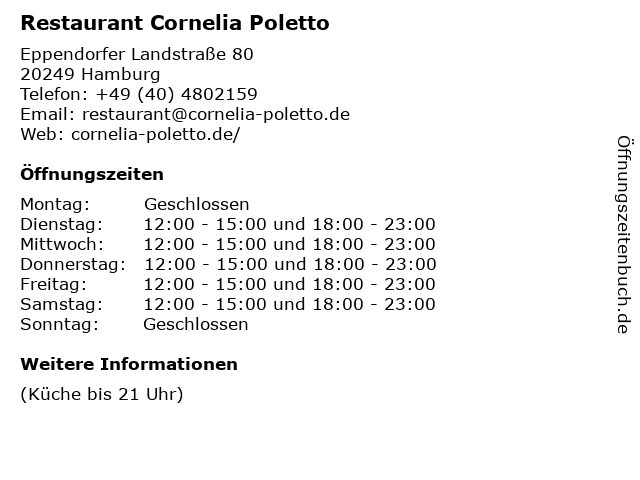 | Öffnungszeiten Restaurant Cornelia Poletto in Hamburg anzeigen | |