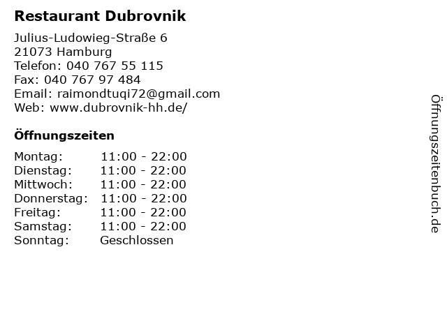 | Öffnungszeiten Restaurant Dubrovnik in Hamburg anzeigen | |
