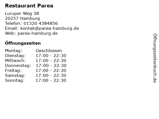 | Öffnungszeiten Restaurant Parea in Hamburg anzeigen | |