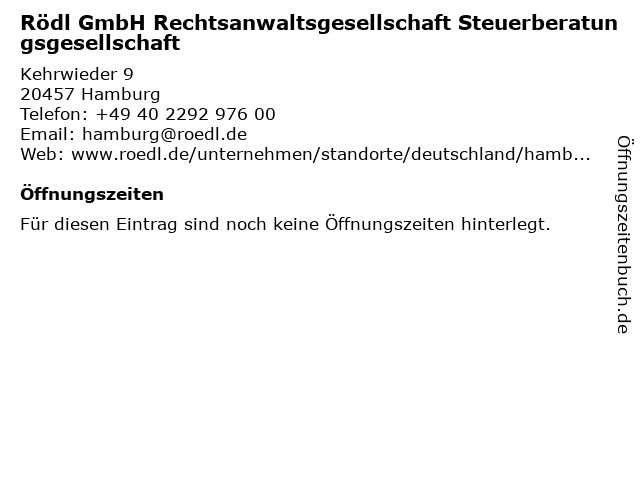 1 Rödl & Partner GmbH Wirtschaftsprüfungsgesellschaft (Entfernung: 0,01 km) Kehrwieder 9, 20457 Hamburg 2 HANSA PARTNER Rommel & Meyer Steuerberatungsgesellschaft (Entfernung: 0,07 km) Kehrwieder 11, 20457 Hamburg 5 6 Ebner Stolz GmbH & Co. KG Wirtschaftsprüfungsgesellschaft Steuerberatungsgesellschaft, Niederlassung Hamburg (Entfernung: 0,45 km) Ludwig-Erhard-Straße 1, 20459 Hamburg  |