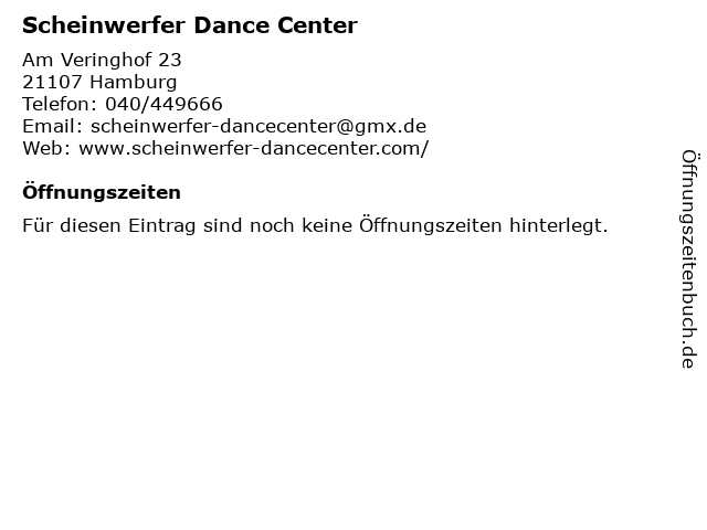 | Öffnungszeiten Scheinwerfer Dance Center in Hamburg anzeigen | |