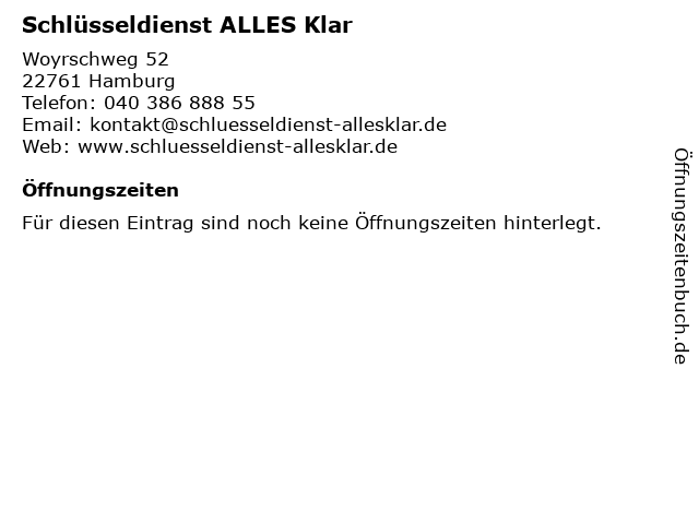 | Öffnungszeiten Schlüsseldienst ALLES Klar in Hamburg anzeigen | |