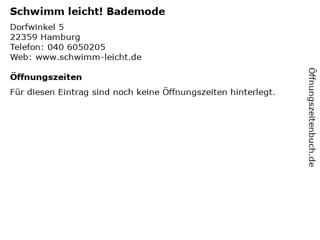 | Öffnungszeiten Schwimm leicht! Bademode in Hamburg anzeigen | |