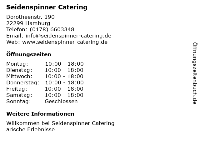 | Öffnungszeiten Seidenspinner Catering in Hamburg anzeigen | |
