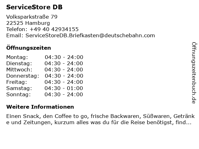 | Öffnungszeiten ServiceStore DB in Hamburg anzeigen | |