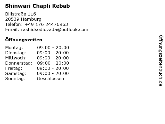 | Öffnungszeiten Shinwari Chapli Kebab in Hamburg anzeigen | |