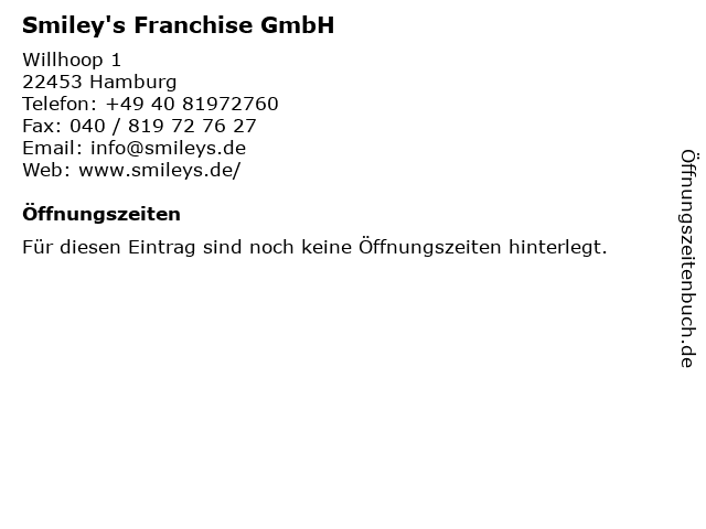 | Öffnungszeiten Smiley's Franchise GmbH in Hamburg anzeigen | |