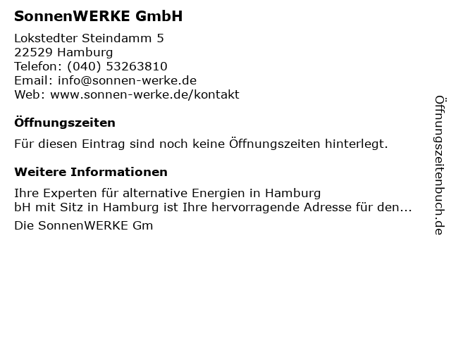 | Öffnungszeiten SonnenWERKE GmbH in Hamburg anzeigen | |