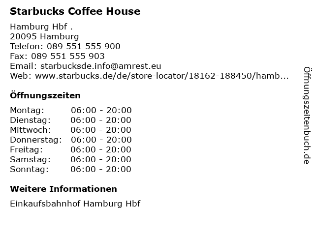 | Öffnungszeiten Starbucks Coffee House in Hamburg anzeigen | |