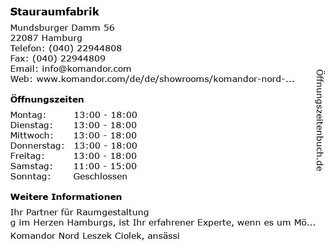 | Öffnungszeiten Stauraumfabrik in Hamburg anzeigen | |
