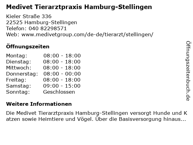 Branchen & Suchbegriffe zu Medivet Tierarztpraxis Hamburg-Stellingen:medivet, stellingen, tierapotheke, tierarztpraxis, tierärzlicher notdienst |