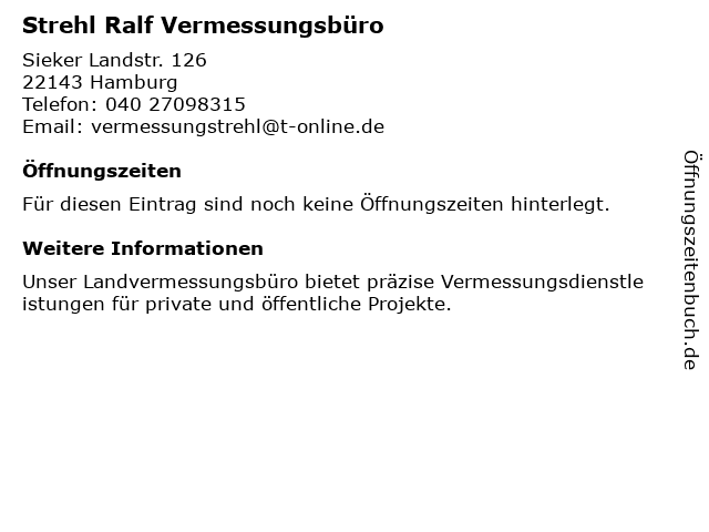 | Öffnungszeiten Strehl Ralf Vermessungsbüro in Hamburg anzeigen | |