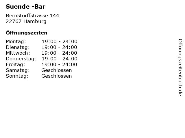 | Öffnungszeiten Suende -Bar in Hamburg anzeigen | |