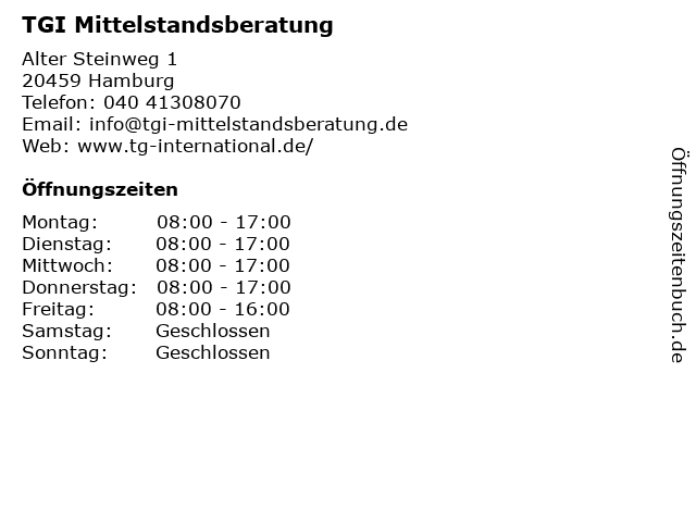 | Öffnungszeiten TGI Mittelstandsberatung in Hamburg anzeigen | |