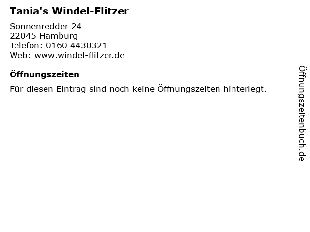 | Öffnungszeiten Tania's Windel-Flitzer in Hamburg anzeigen | |