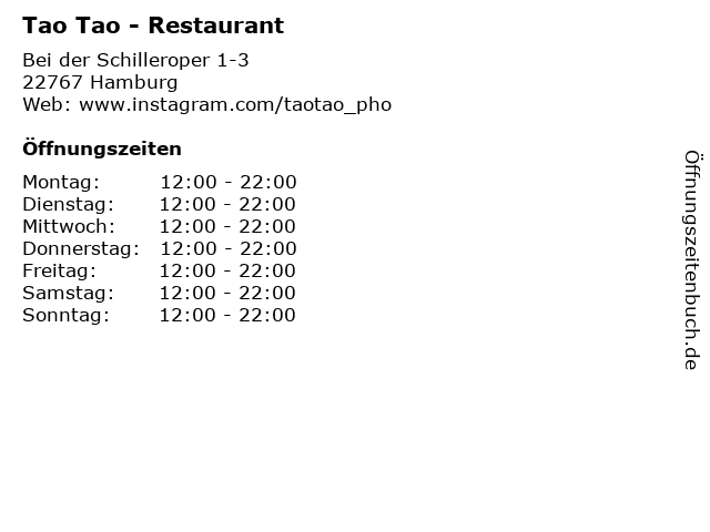 | Öffnungszeiten Tao Tao - Restaurant in Hamburg anzeigen | |