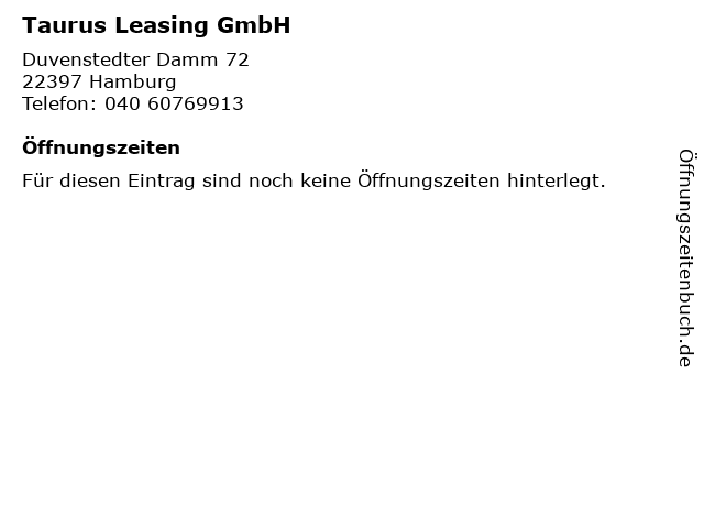 | Öffnungszeiten Taurus Leasing GmbH in Hamburg anzeigen | |
