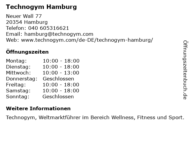 | Öffnungszeiten Technogym Hamburg in Hamburg anzeigen | |