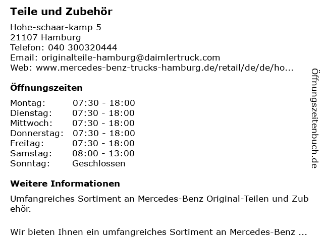| Öffnungszeiten Teile und Zubehör in Hamburg anzeigen | |