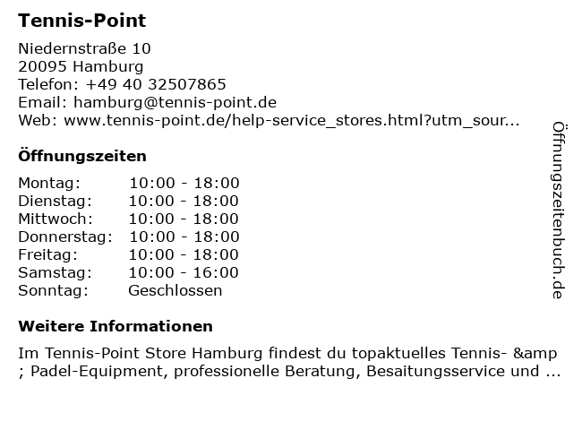 | Öffnungszeiten Tennis-Point in Hamburg anzeigen | |