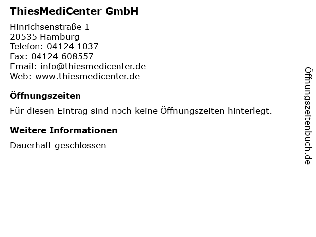 | Öffnungszeiten ThiesMediCenter GmbH in Hamburg anzeigen | |