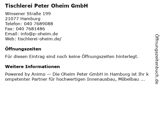 | Öffnungszeiten Tischlerei Peter Oheim GmbH in Hamburg anzeigen | |