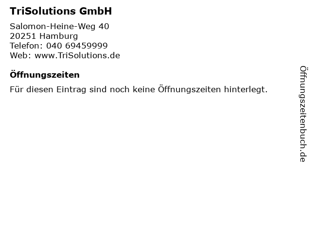 | Öffnungszeiten TriSolutions GmbH in Hamburg anzeigen | |