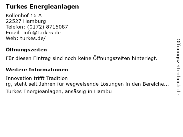 | Öffnungszeiten Turkes Energieanlagen in Hamburg anzeigen | |