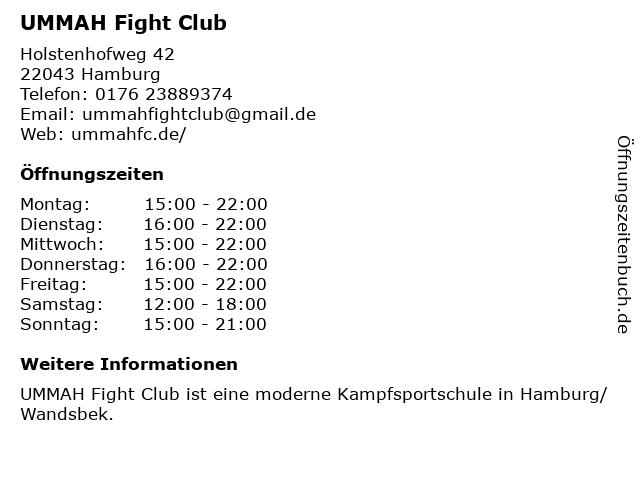 | Öffnungszeiten UMMAH Fight Club in Hamburg anzeigen | |