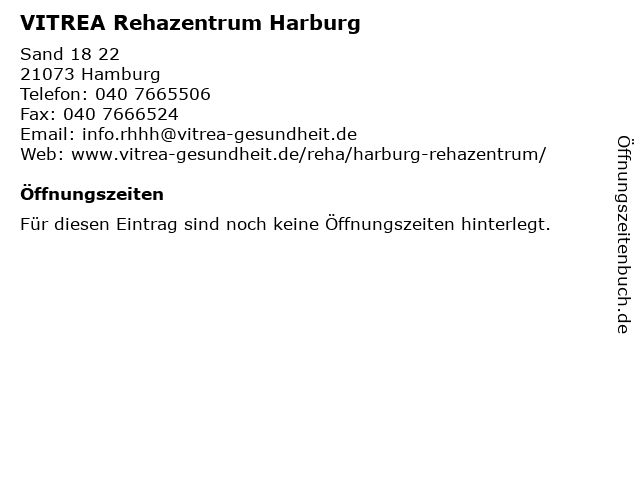 | Öffnungszeiten VITREA Rehazentrum Harburg in Hamburg anzeigen | |