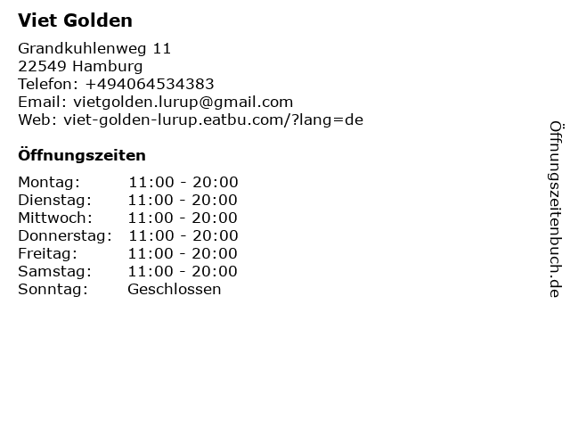 | Öffnungszeiten Viet Golden in Hamburg anzeigen | |