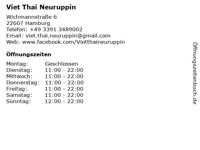 | Öffnungszeiten Viet Thai Neuruppin in Hamburg anzeigen | |