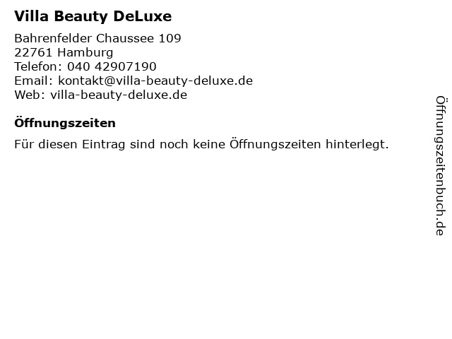 | Öffnungszeiten Villa Beauty DeLuxe in Hamburg anzeigen | |