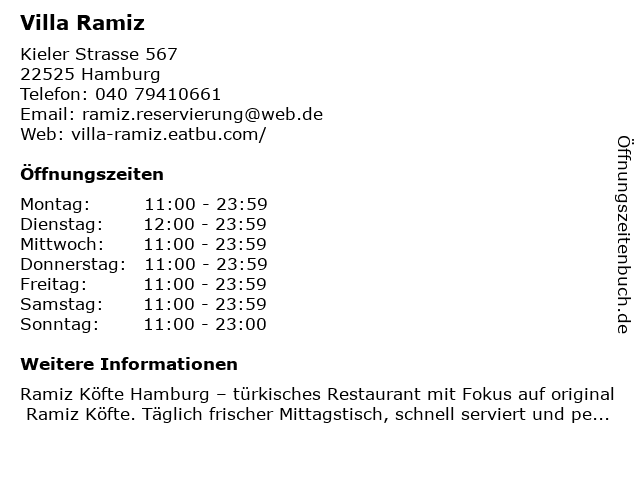 | Öffnungszeiten Villa Ramiz in Hamburg anzeigen | |