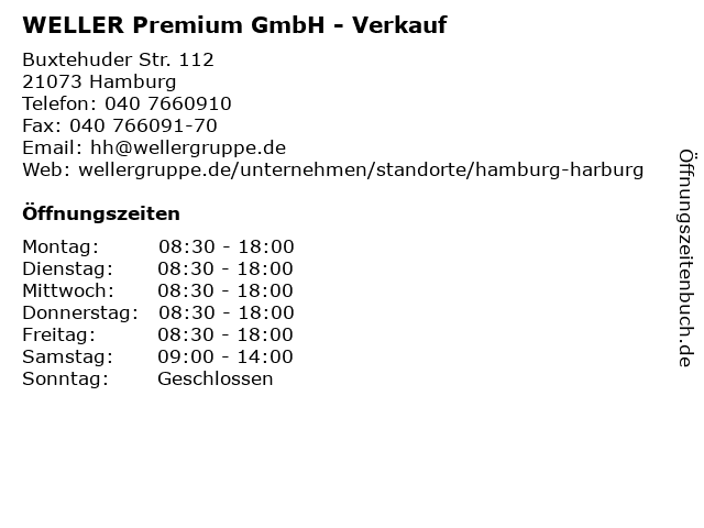 | Öffnungszeiten WELLER Premium GmbH - Verkauf in Hamburg anzeigen | |