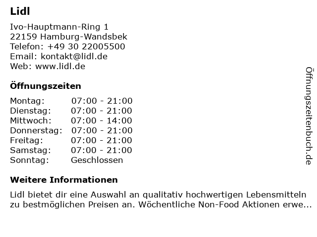 | Öffnungszeiten Lidl in Hamburg-Wandsbek anzeigen | |