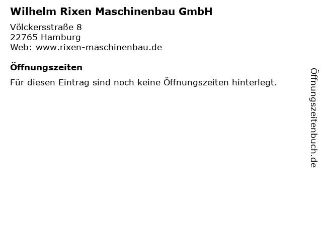 | Öffnungszeiten Wilhelm Rixen Maschinenbau GmbH in Hamburg anzeigen | |