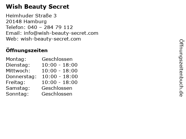 | Öffnungszeiten Wish Beauty Secret in Hamburg anzeigen | |