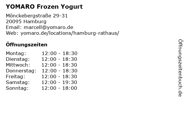 | Öffnungszeiten YOMARO Frozen Yogurt in Hamburg anzeigen | |