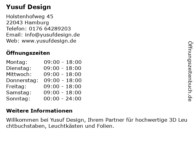 | Öffnungszeiten Yusuf Design in Hamburg anzeigen | |