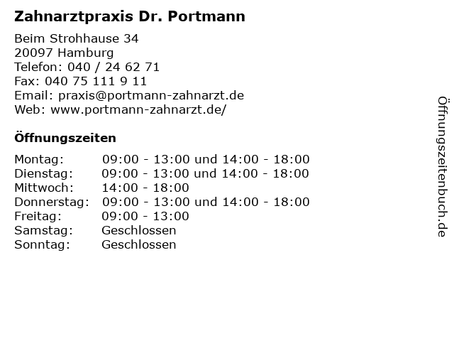 | Öffnungszeiten Zahnarztpraxis Dr. Portmann in Hamburg anzeigen | |