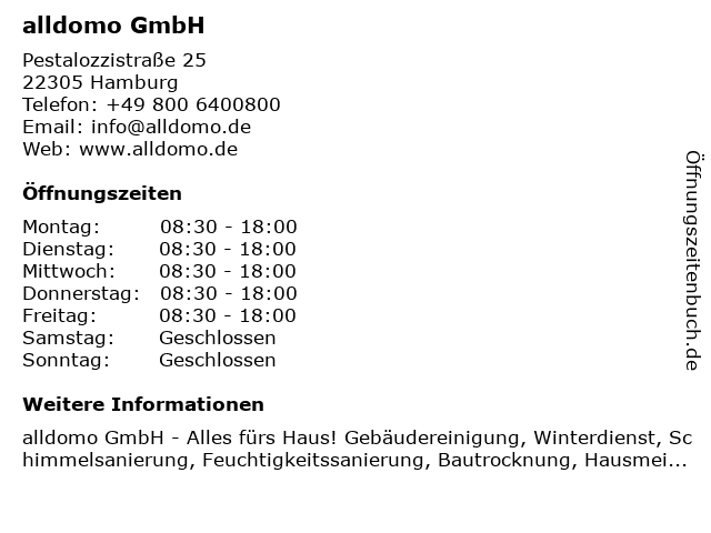 | Öffnungszeiten alldomo GmbH in Hamburg anzeigen | |