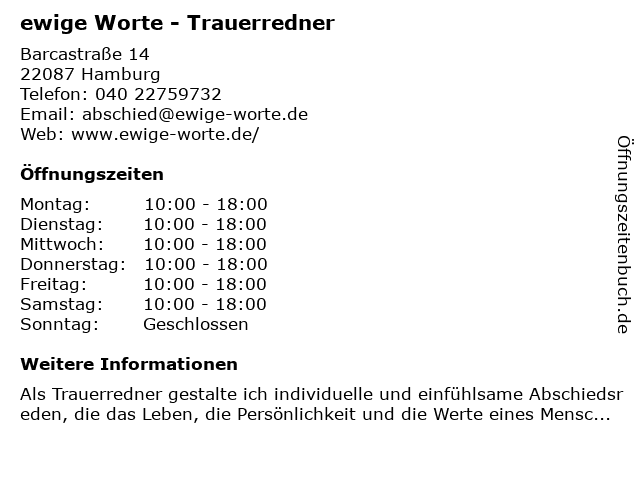 | Öffnungszeiten ewige Worte - Trauerredner in Hamburg anzeigen | |