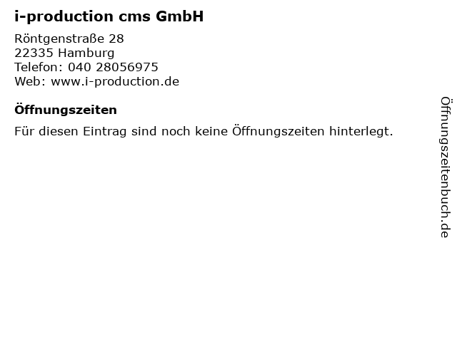| Öffnungszeiten i-production cms GmbH in Hamburg anzeigen | |
